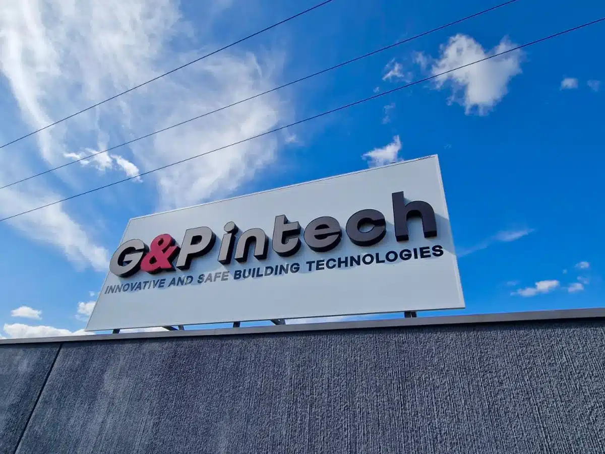 G&P Intech - Altavilla Vicentina (VI): insegna a lettere scatolate a luce diretta con frontale black and white (di giorno nera di sera bianca) assemblata su pannello di fondo